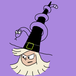 A cartoon witch character with a tall black hat and a purple snake coiled around it.