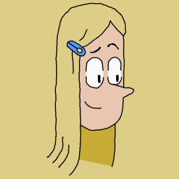 A cartoon illustration of a female character with long blonde hair and a blue hair clip on a tan background.