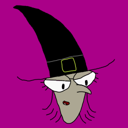 A cartoon illustration of a character with grey skin and a tall black witch hat on a purple background.