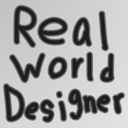 A minimalist icon features dark, handwritten text "Real World Designer" over a gray background.