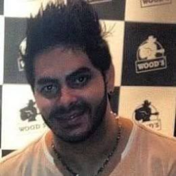 A close-up portrait of a man with a checkered background.