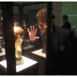 A person looking at a golden trophy through a glass display.